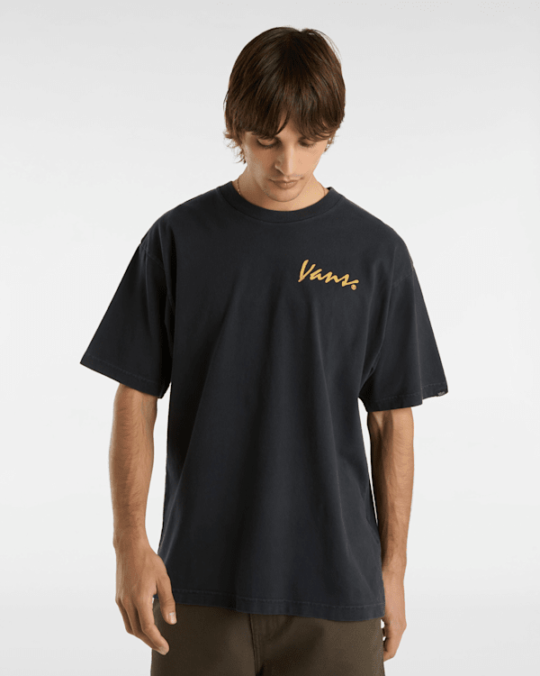 Tento t-shirt má krátké rukávy a vysoký krk. Na levé straně je umístěn logotyp Vans, zatímco na zádech jsou umístěny obrázky s motivem Off the Wall.