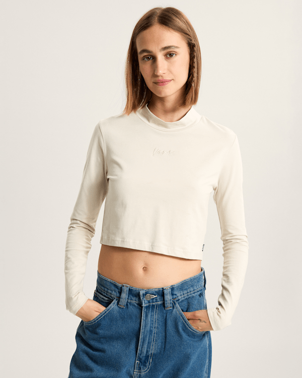 Vans Script Mini Mock T-Shirt je ideální volbou pro ženy, které hledají pohodlný a stylový oděv. Tento model má dlouhé rukávy, mock neck a krátkou výšku. Na přední straně je umístěn logotyp Vans.