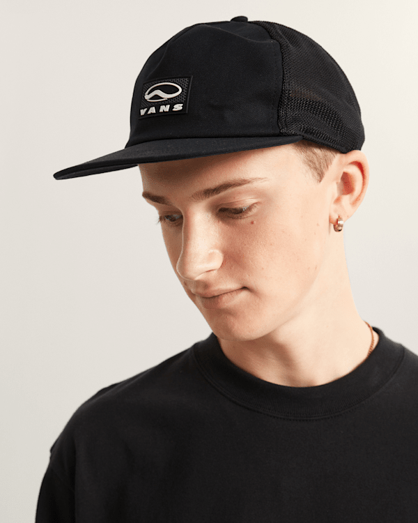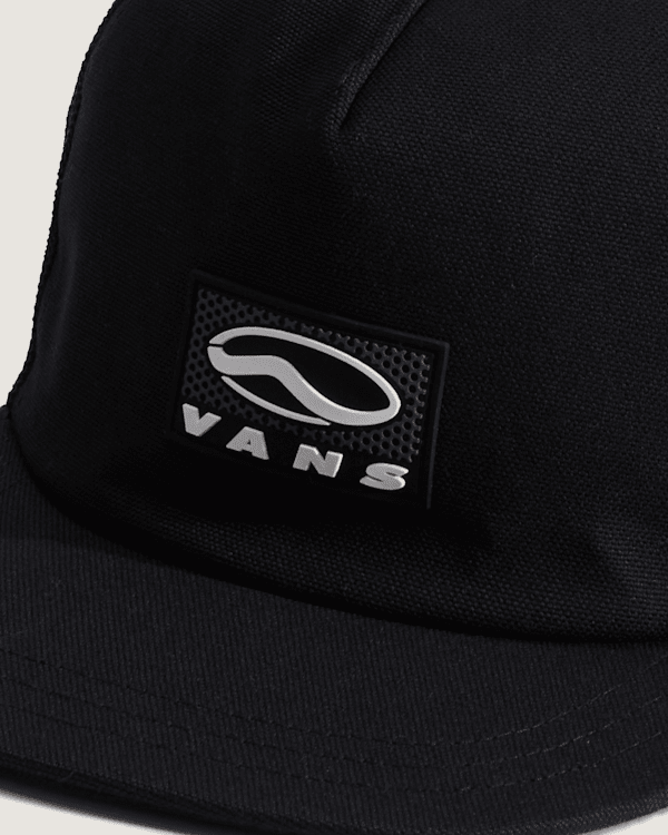 Unikátní trucker s flat bill, mesh back a bold TPU front patch, který odkazuje na historii Vans a zůstává lehký pro denní nošení.