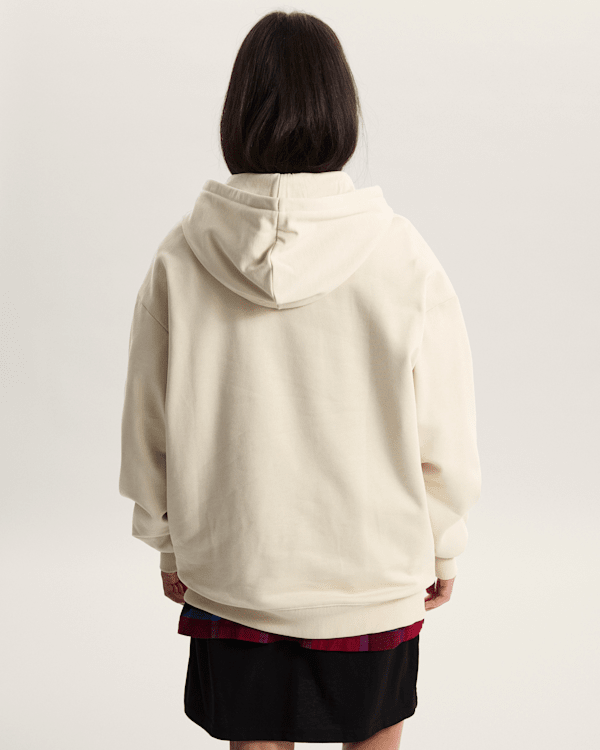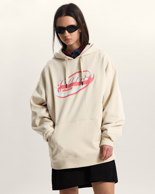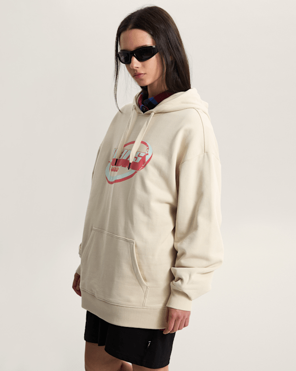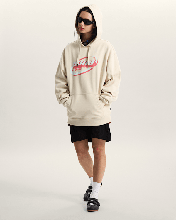Hoodie je k dispozici v elegantní béžové barvě, která se snadno kombinuje s různými outfity. Jeho design je inspirován retro futurismem, což se odráží v výrazném logu Vans na přední straně. Dlouhé rukávy a prostorná kapsa na přední straně dodávají tomuto kousku nejen styl, ale také praktickou funkčnost pro uložení drobností.